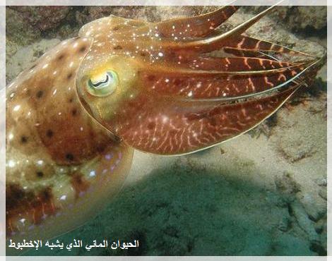 الحيوان المائي الذي يشبه الإخطبوط هو الحبار . الحبار يصنف من اللافقاريات ومن الكائنات البحرية الرخوية الصغيرة والمتوسطة الحجم التي توجد في جميع أنحاء مياه المحيط في العالم. و يمتلك الحبار جسم كبير ممدود مع مخالب تحيط بأفواهه مثل الإخطبوط . له ثماني أذرع طويلة . ويوجد على سطح جسمه قشرة تعمل كهيكل عظمي تساعده على الطفو فوق سطح الماء وهذه القشرة مكونة من كربونات الكالسيوم. لديه خياشيم تساعده في التنفس مثل الأسماك . وقد تم العثور على الحبار بأعداد كبيرة في جميع أنحاء مياه المحيطات في العالم . الحبار معروف بالألوان الوامضة التي تظهر على أجسامهم أثناء القتال أو التزاوج. الحبار يمتلك أيضاً كيس حبر يخرج الحبر من أجل خداع الحيوانات المفترسة القادمة. هناك 120 نوعا معروف من الحبار وجدت في جميع أنحاء العالم والتي تختلف في حجمها من 15 سم إلى الحبار العملاق الاسترالي الذي هو في كثير من الأحيان يصل طوله إلى نصف متر أما بالنسبة لوزنه فهو يزن أكثر من 10 كجم.