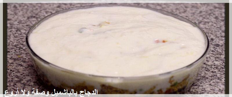 يضاف الباشميل على الوجه ، ثم ترش الجبنة البارميزان ، الزبدة ، والبقسماط على الوجه .