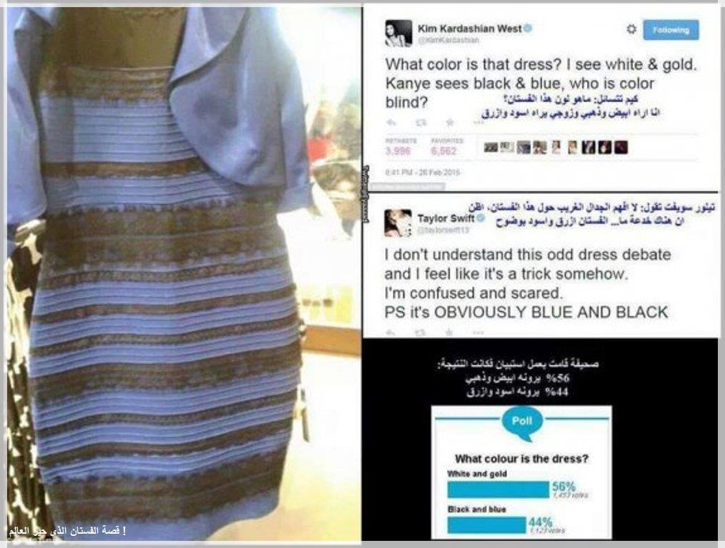 امتلأت مواقع التواصل الاجتماعي الفيسبوك وتويتر بهاشتاق ( #لون_الفستان) في الدول العربية وهاشتاق (#ِTheDress) في الدول العالمية الأخرى ، وذلك بسبب صورة فستان تم انتشارها بشكل كبير بين مستخدمي مواقع التواصل الاجتماعي وخاصة تويتر ، الذي شهد تغريدات فاقت المليون تغريدة منذ أن وضعت صورة الفستان يوم الجمعة 27/2/2015 وحتى الساعة . حيث حدث جدلا كبيرا على لون الفستان المعني ، الذي كان يعتقد عددا كبيرا بأنه باللون الأبيض والذهبي ، وبالمقابل آخرون اعتقدوا بأنه باللون الازرق والاسود ، وقد فسر البعض بأن الإضاءة المحيطة بالفستان هي السبب وراء تغير لونه .