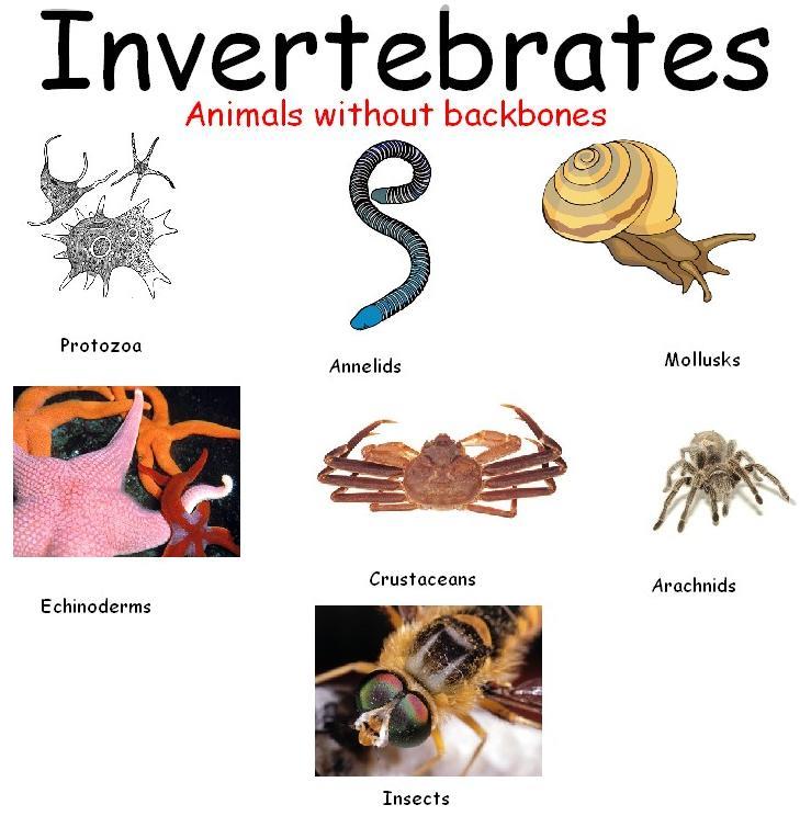 اللافقاريات هي الحيوانات التي ليس لها عمود فقري أو هيكل عظمي . وقد حدد العلماء ان هناك ما يقرب من مليون نوع من الكائنات الحية من اللافقاريات ، بينما هناك عدد محدود من اللافقارايات مازالت على قيد حياة . ويقدر العلماء أن أشهر الحيوانات اللافقاريات تشمل المفصليات ، الكائنات الرخوة كالكائنات المجوفة ، شوكيات الجلد والرخويات والديدان المقسمة والإسفنج . وتشمل بعض الجماعات الأقل شهرة ctenophores ، platyheominthes ، النيماتودا ، الدوارات ، braciopods ، lorciferans وbryozoans . ومن هذه الحيوانات : البروتوزوا ، ديدان الأرض ، والمحار وبلح البحر ونجم البحر ، البروتوزوا ، الحلقيات ، الرخويات ، وسرطان البحر ، العنكبوت ، اليعسوب ، القشريات ، الفصائل العنكبوتيات ، الحشرات